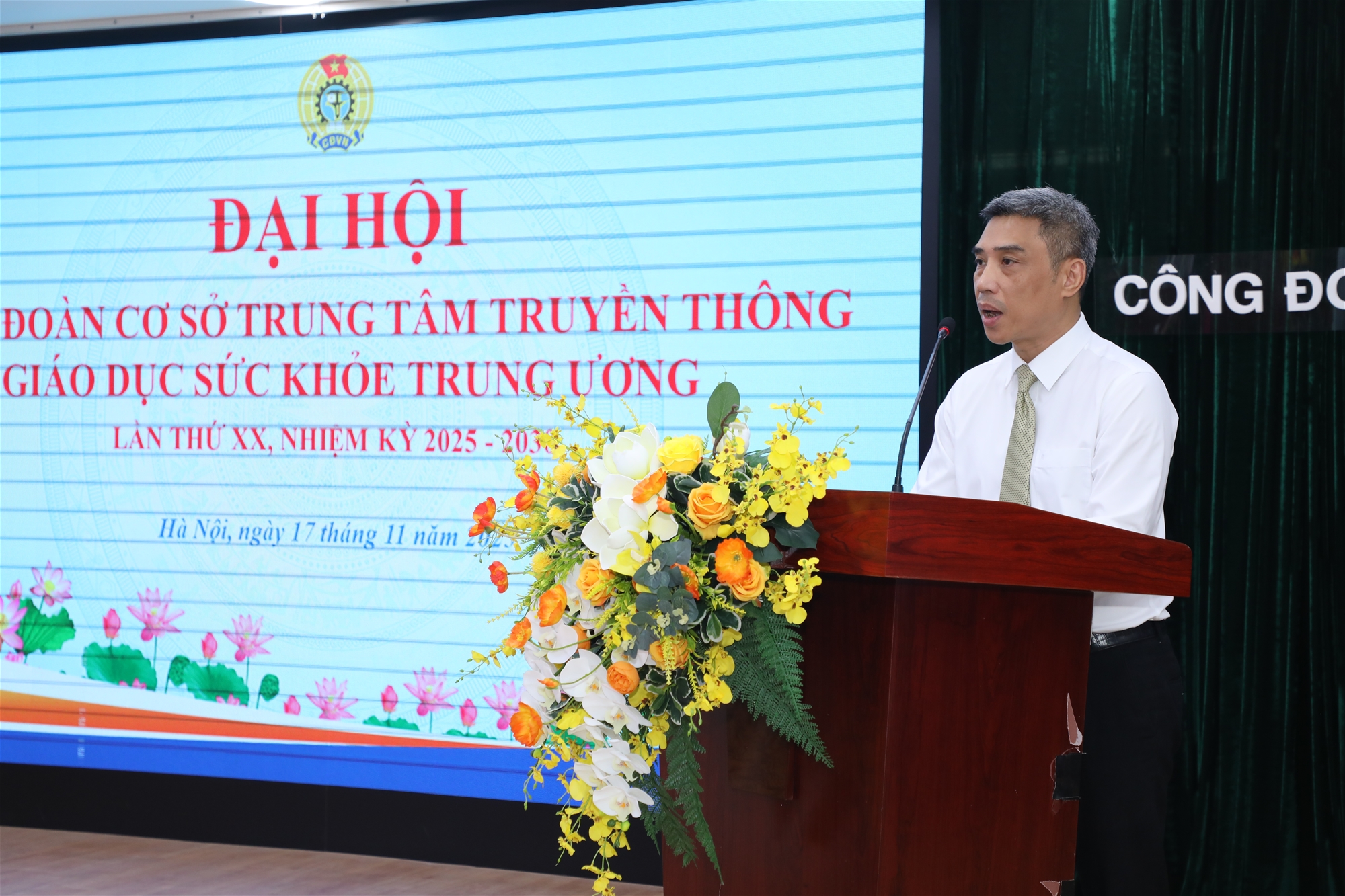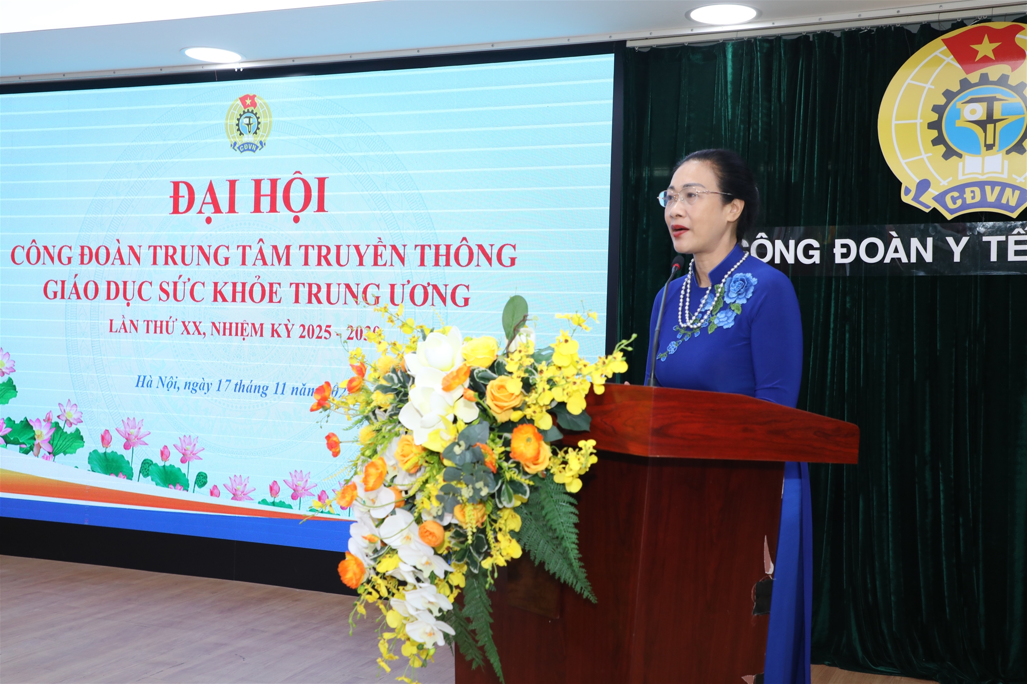 Phát biểu chỉ đạo tại Đại hội, Chủ tịch Công đoàn Y tế Việt Nam, PGS.TS Phạm Thanh Bình khẳng định, nhiệm kỳ vừa qua, Công đoàn cơ sở Trung tâm Truyền thông - GDSK Trung ương đã có nhiều hoạt động tích cực, góp phần không nhỏ vào thành tích chung của Công đoàn ngành. Chủ tịch Công đoàn Y tế Việt Nam mong muốn Công đoàn cơ sở Trung tâm tiếp tục là một tổ chức vững mạnh trong nhiệm kỳ tới.