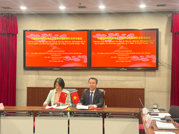 Trong khuôn khổ chuyến công tác, ngày 13/4/2026, Học viện và Viện Nghiên cứu Khoa học Công nghệ và Giáo dục Phát triển Quốc gia Hưng Thái (Bắc Kinh, Trung Quốc) gồm ông Hồ Tỏa Cẩm; Phó Chủ tịch kiêm Tổng Thư ký Hiệp hội Hợp tác Kinh tế Quốc tế Trung Quốc, nguyên Tham tán Thương mại hàm Công sứ, Đại sứ quán Trung Quốc tại Việt Nam; ông Cương Tam Bình, Bí thư Đảng ủy Viện Nghiên cứu và bà Lý Quyên, Chủ nhiệm Ủy ban Chuyên môn Hợp tác Giáo dục - Công nghiệp Hợp triển, Hiệp hội Hợp tác Kinh tế Quốc tế Trung Quốc; Viện trưởng Viện Nghiên cứu Khoa học Công nghệ Giáo dục và Phát triển Quốc gia Hưng Thái, Bắc Kinh đã ký kết Biên bản ghi nhớ hợp tác (MOU). Hai bên đã trao đổi, thảo luận phương án triển khai dự án đào tạo tiến sĩ; trong đó đại diện Đại học Trung Y Dược Bắc Kinh trình bày cụ thể các yêu cầu về năng lực ngoại ngữ, tiêu chuẩn công bố khoa học và các điều kiện đào tạo.