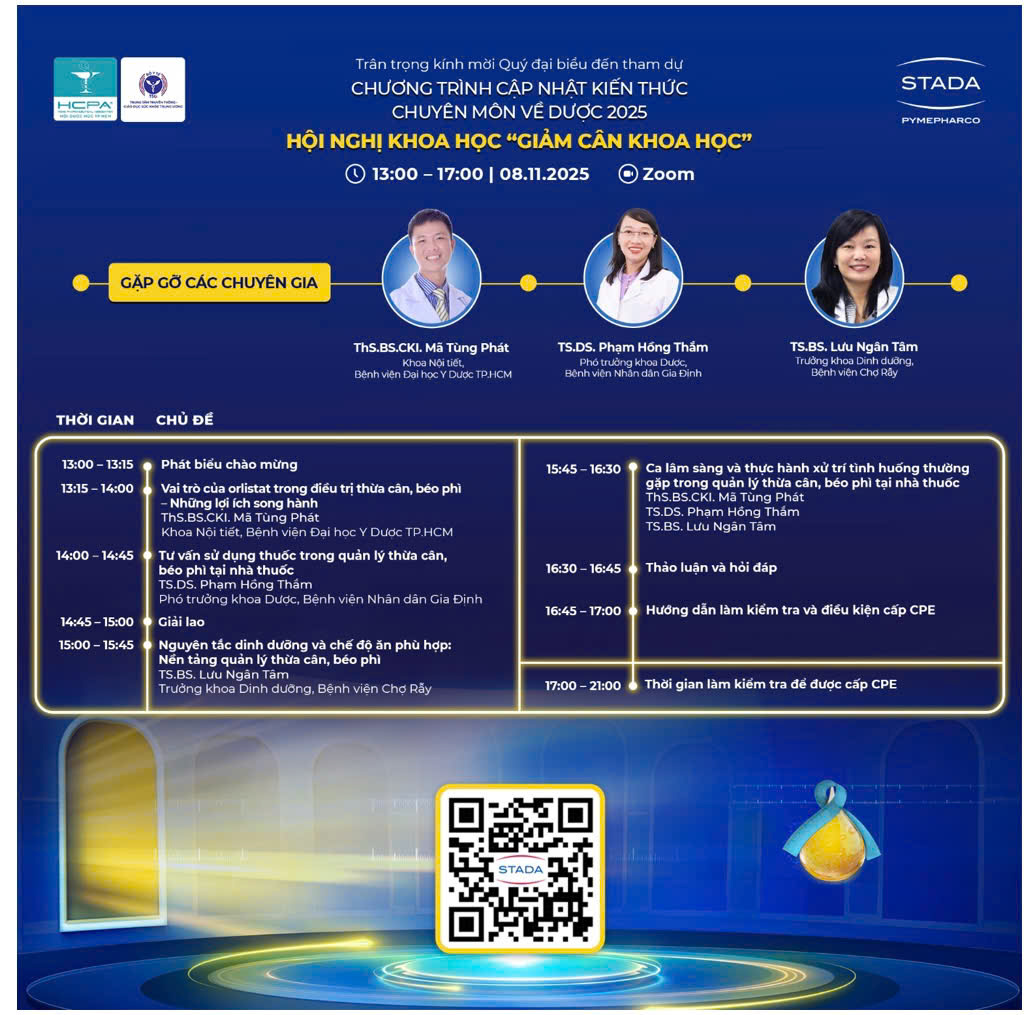 Hội thảo khoa học “Giảm cân khoa học” đã nhận được sự tham gia tích cực của đông đảo dược sĩ và nhân viên y tế trên toàn quốc. Hội thảo này là hoạt động nằm trong khuôn khổ Chương trình Cập nhật Kiến thức Chuyên môn về Dược 2025 (STADA Academy 2025) do STADA Pymepharco tổ chức, với sự hỗ trợ truyền thông của Trung tâm Truyền thông - GDSK Trung ương, Bộ Y tế, cùng với sự phối hợp của Hội Dược học TP. Hồ Chí Minh (HCPA).