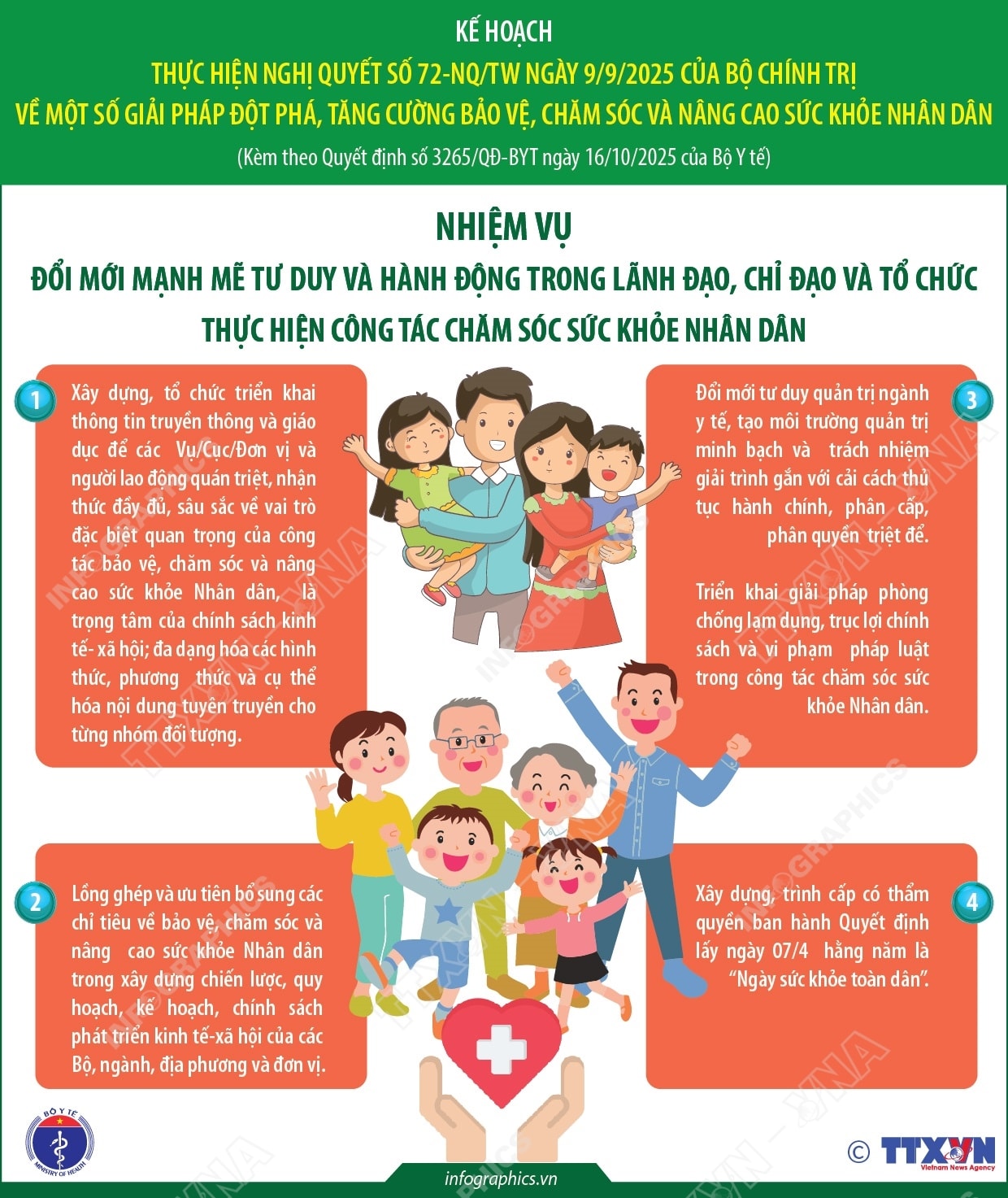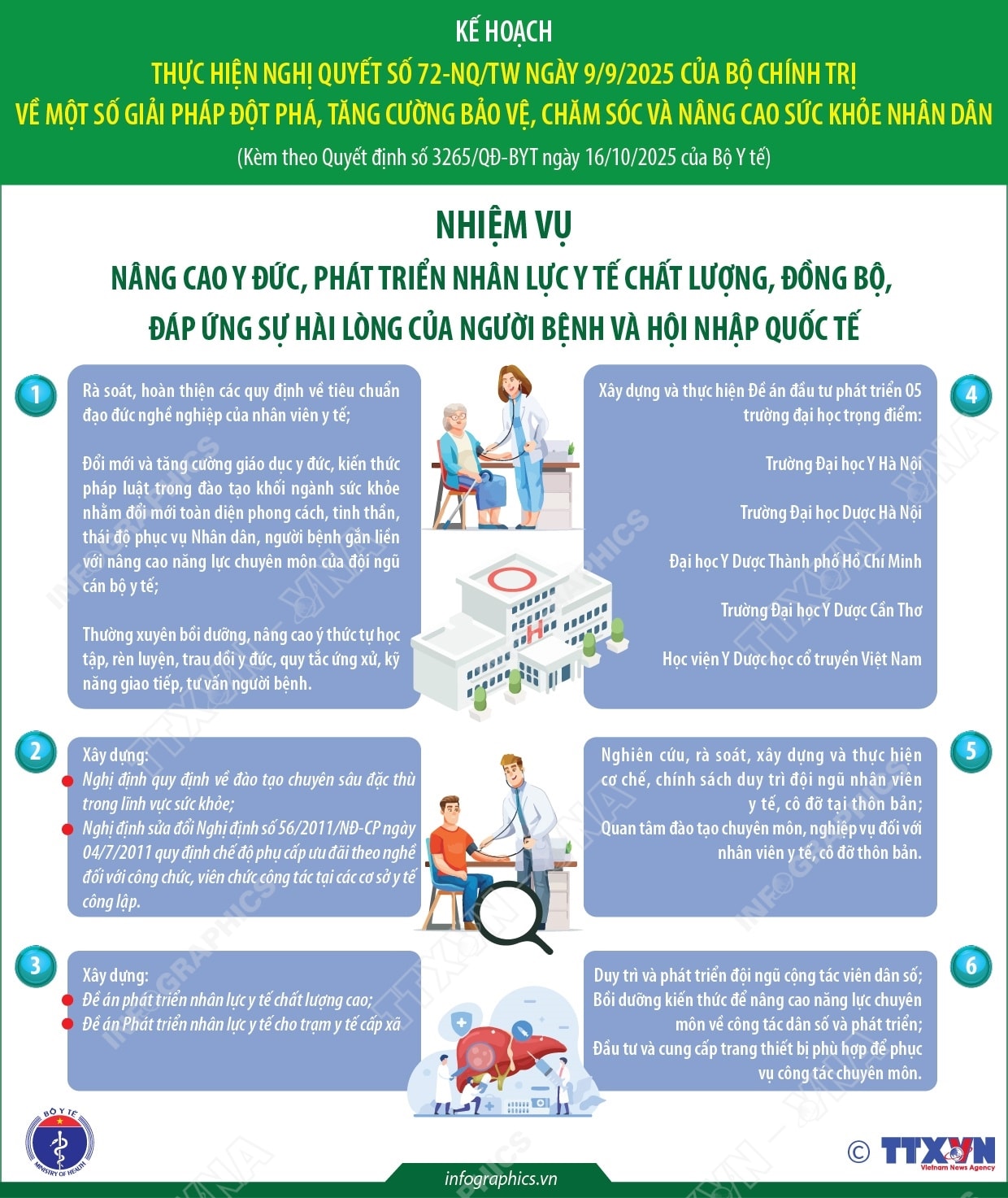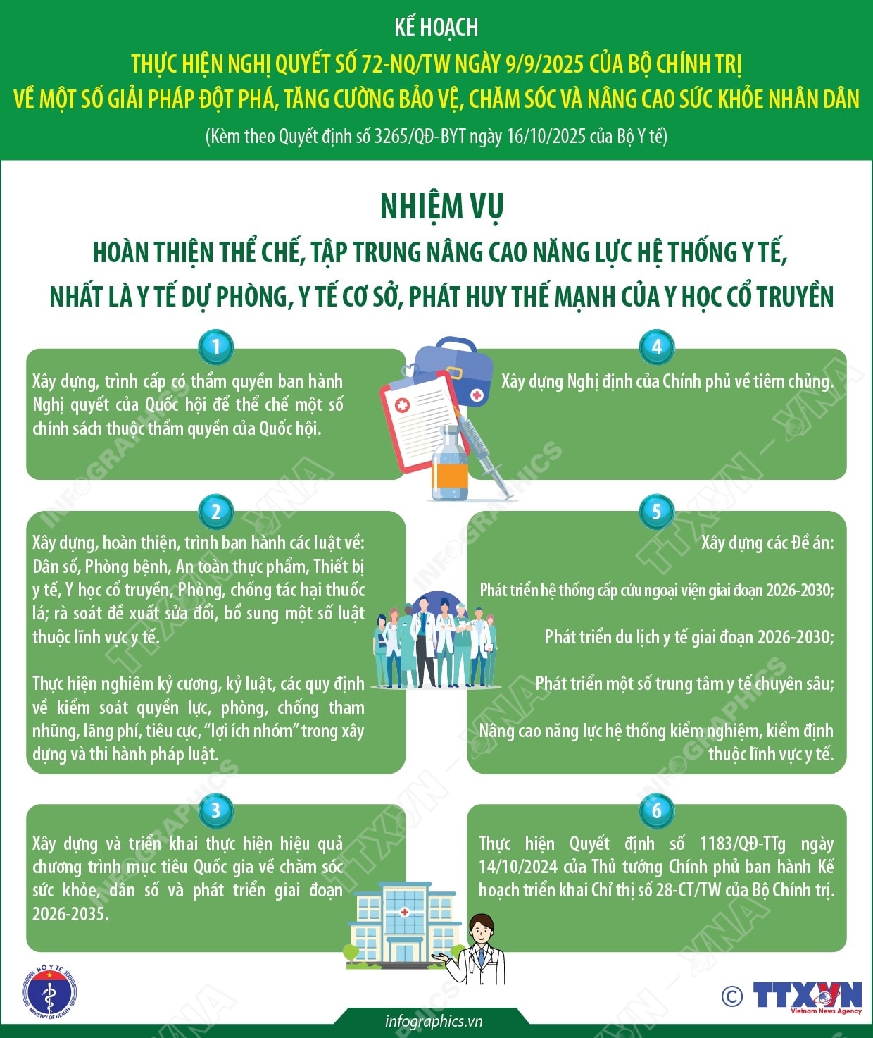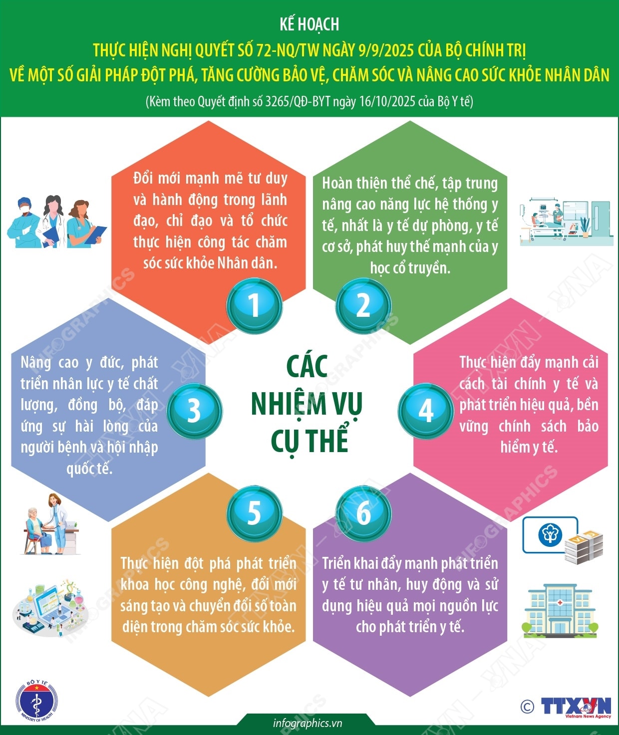 Kế hoạch thực hiện Nghị quyết số 72-NQ/TW của Bộ Chính trị 31/12/2025 01:58 PM | T5g.org.vn - Bộ Y tế đã ban hành kế hoạch thực hiện Nghị quyết số 72-NQ/TW ngày 09/9/2025 của Bộ Chính trị về một số giải pháp đột phá, tăng cường bảo vệ, chăm sóc và nâng cao sức khỏe nhân dân. Kế hoạch đề ra 6 nhiệm vụ cụ thể để tăng cường bảo vệ, chăm sóc và nâng cao sức khỏe Nhân dân: Đổi mới mạnh mẽ tư duy và hành động trong lãnh đạo, chỉ đạo và tổ chức thực hiện công tác chăm sóc sức khỏe Nhân dân; Hoàn thiện thể chế, tập trung nâng cao năng lực hệ thống y tế, nhất là y tế dự phòng, y tế cơ sở, phát huy thế mạnh của y học cổ truyền; Nâng cao y đức, phát triển nhân lực y tế chất lượng, đồng bộ, đáp ứng sự hài lòng của người bệnh và hội nhập quốc tế; Thực hiện đẩy mạnh cải cách tài chính y tế và phát triển hiệu quả, bền vững chính sách bảo hiểm y tế; Thực hiện đột phá phát triển khoa học công nghệ, đổi mới sáng tạo và chuyển đổi số toàn diện trong chăm sóc sức khỏe và triển khai đẩy mạnh phát triển y tế tư nhân, huy động và sử dụng hiệu quả mọi nguồn lực cho phát triển y tế. Nguồn: TTXVN
