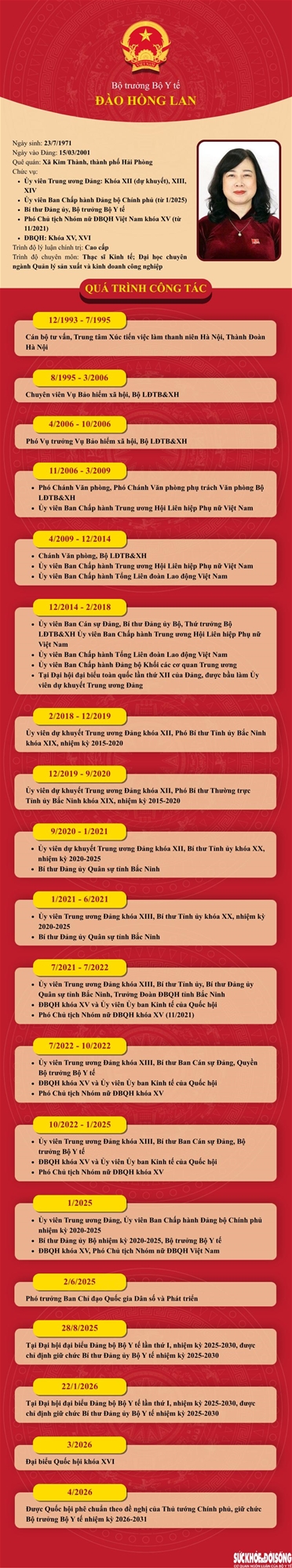 Quốc hội phê chuẩn bổ nhiệm đồng chí Đào Hồng Lan giữ chức Bộ trưởng Bộ Y tế nhiệm kỳ mới 08/04/2026 02:31 PM | T5g.org.vn - Đồng chí Đào Hồng Lan đã được Quốc hội phê chuẩn theo đề nghị của Thủ tướng Chính phủ, giữ chức Bộ trưởng Bộ Y tế nhiệm kỳ 2026-2031. Bộ trưởng Bộ Y tế Đào Hồng Lan Sáng 8/4, Quốc hội phê chuẩn đề nghị của Thủ tướng Chính phủ về việc bổ nhiệm chức vụ bộ trưởng, thành viên Chính phủ nhiệm kỳ 2026-2031 đối với 17 đồng chí. Với 481/481 đại biểu tham gia biểu quyết tán thành, đạt 100% số đại biểu có mặt, tương đương 96,20% tổng số đại biểu Quốc hội, đồng chí Đào Hồng Lan đã tiếp tục được tín nhiệm giữ chức Bộ trưởng Bộ Y tế nhiệm kỳ 2026-2031.