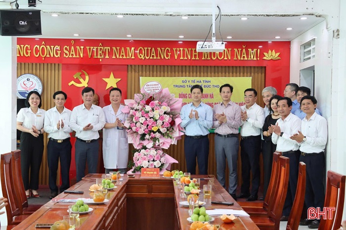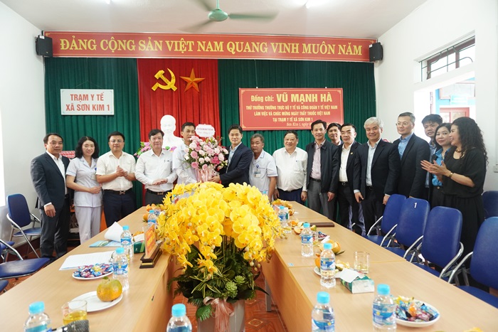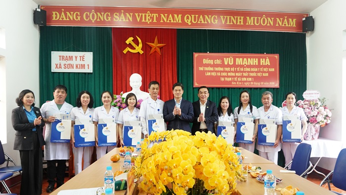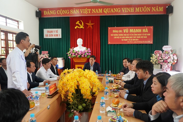 Ghi nhận, biểu dương những đóng góp của tập thể Trạm Y tế xã Sơn Kim 1, Trung tâm Y tế Đức Thọ trong công tác chăm sóc sức khỏe Nhân dân, Thứ trưởng Thường trực Bộ Y tế Vũ Mạnh Hà đã tặng hoa, chúc mừng. Thứ trưởng mong đội ngũ y, bác sỹ tiếp tục phát huy y đức, nâng cao chất lượng khám, chữa bệnh.